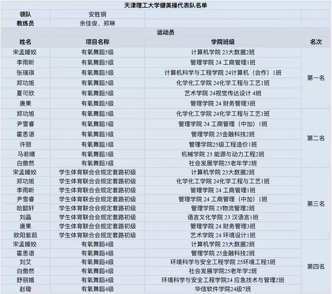 2025年12月14日,2025年天津市大中小学健美操比赛如期开赛,全市各高校代表队同台竞技,尽显青春竞技活力。我校健美操代表队凭借扎实功底与默契协作奋勇拼搏,最终斩获多项优异成绩,其中有氧舞蹈5级获第一名,有氧舞蹈3级获第二名,学生体育联合会规定套路初级获第三名,有氧舞蹈4级获第四名,充分彰显天理学子的青春风貌与竞技实力。