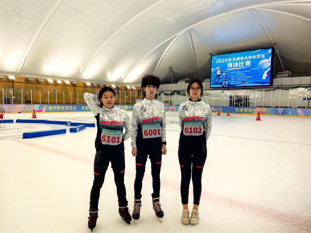 近日,天津市第一届大中小滑冰比赛在天津奥林匹克中心滑冰馆进行。学校代表25级语言文化学院王刘陈曦、24级海洋能源学院王欣珂、24级集成电路科学与工程学院王焱燊,在200米追逐赛、500米竞速赛、蛇形绕转三个项目中奋勇争先,最终斩获 三个第三名 ,一个第四名,一个第六名,一个第八名的 亮眼成绩,为校争光。